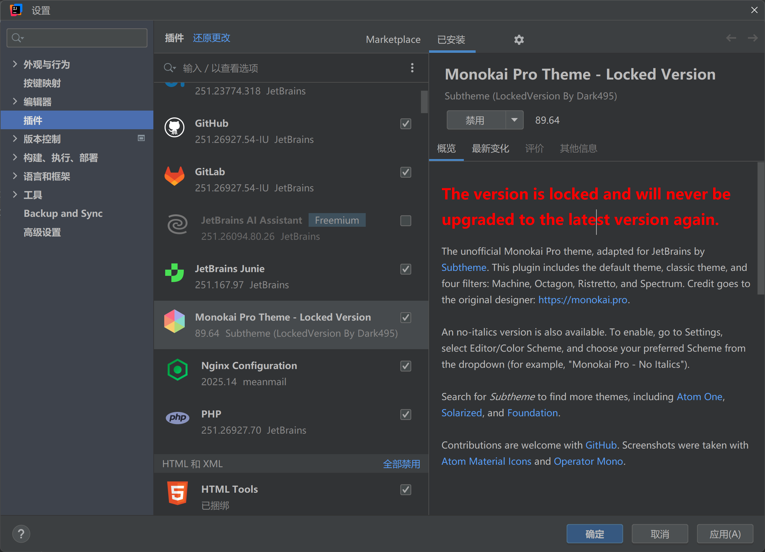 于是我解压了这个插件的 1.10 版本,然后把版本号和插件 ID 乱改一通,以此实现了让此插件永不升级。